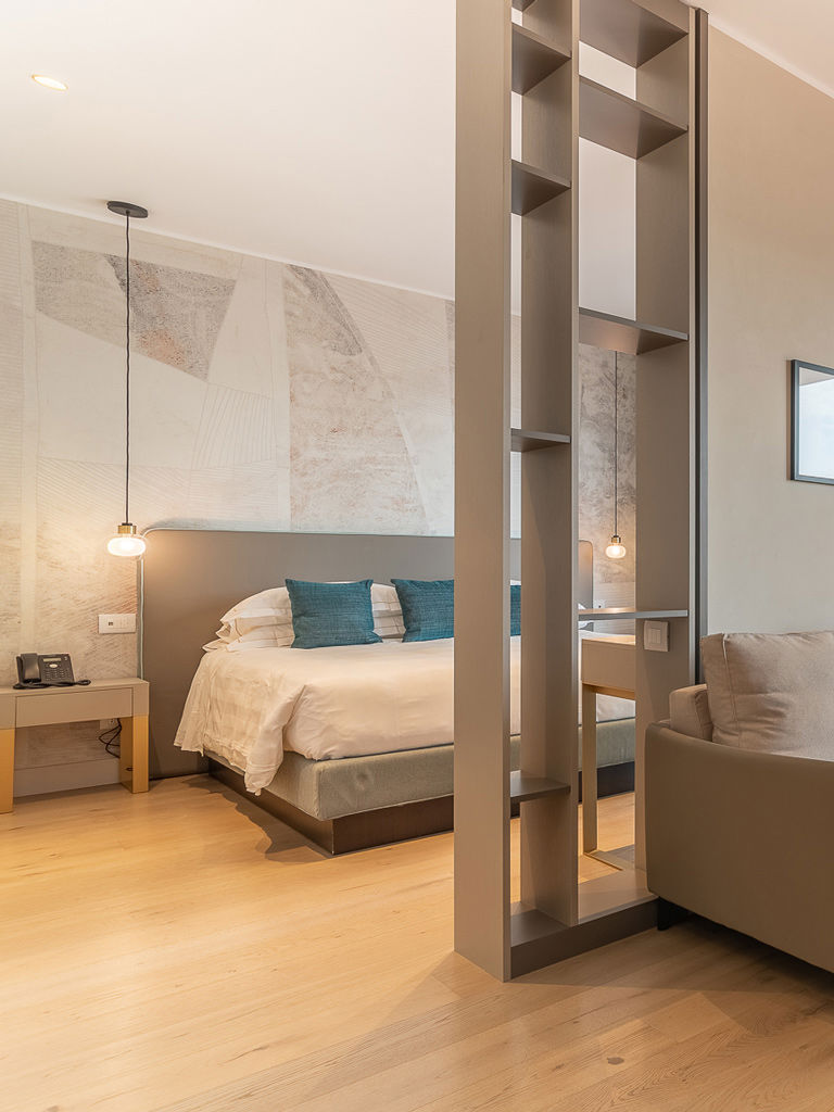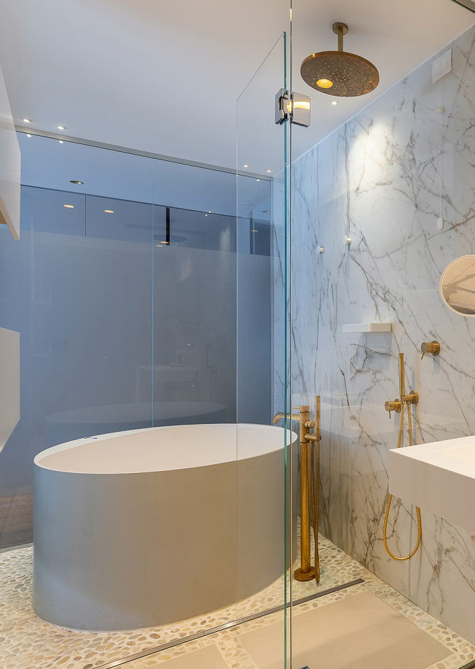 Sea view room with king size bed and sofa bed for one person. Design bathroom with bathtub and shower.
